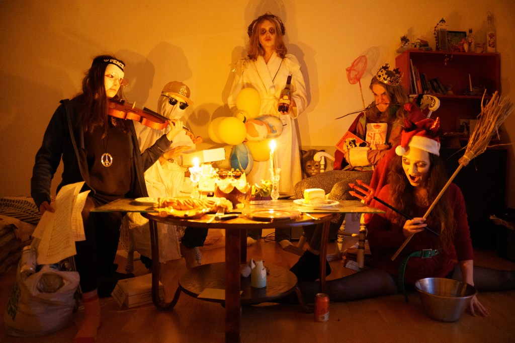 Ni läser upp dem tillsammans i smågrupper och ingen vet hur måltiden slutar förrän den är över, förutsatt att ni lyssnar noga på varann – var och en har bara sina egna repliker, och två ord från föregående replik för att inte kollra bort sig. Förtäringen inkarneras således av er. Utöver salt och peppar kryddas den med blickar, lösmustascher, tvekan, solglasögon och lustiga hattar. En livemusiker smyger mellan borden och översätter det hen hör till musik i realtid. Under tiden pågår en levande vernissage då karaktärer från manusen tassar runt i salen.